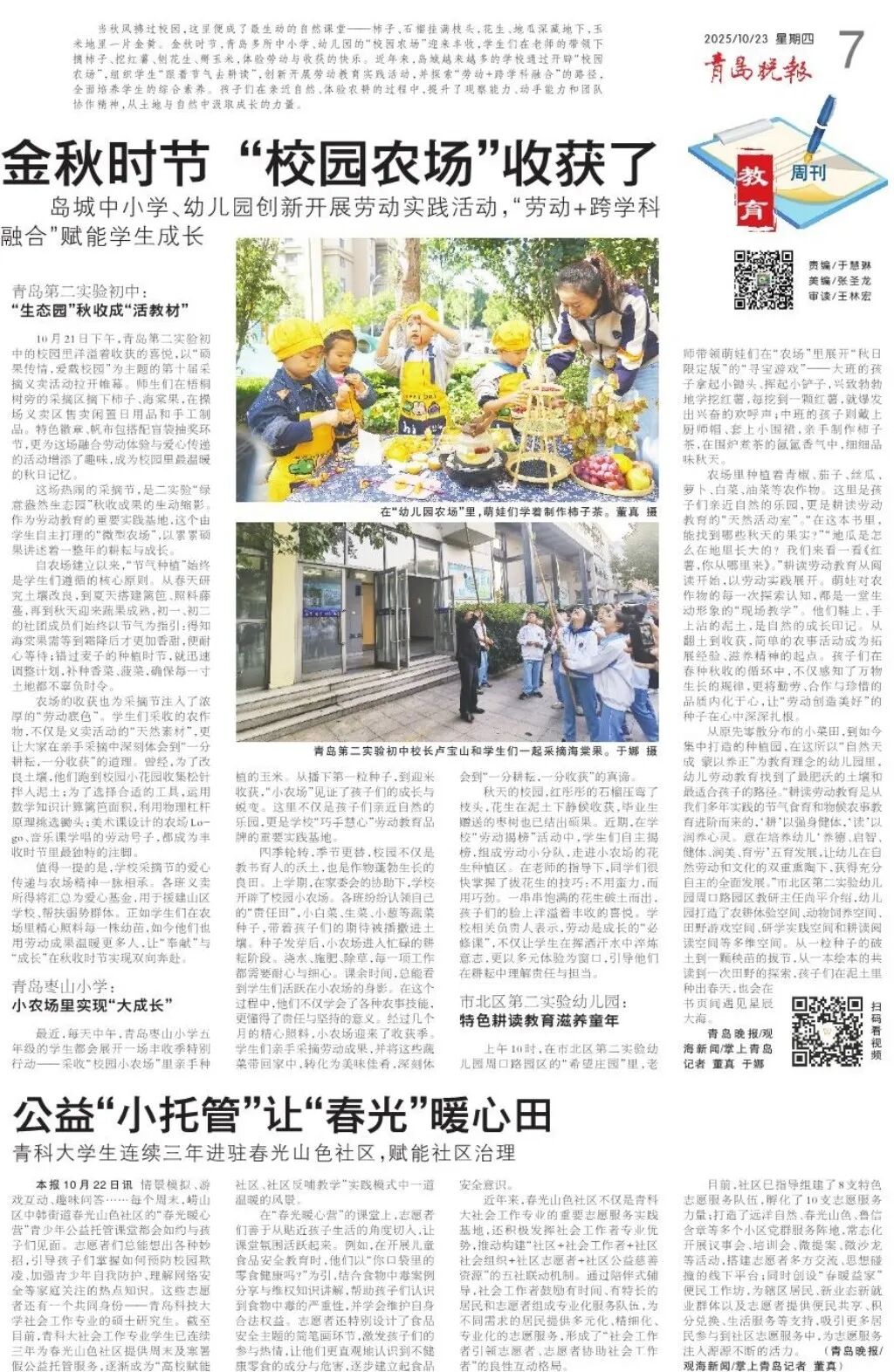 每个周末,崂山区中韩街道春光山色社区的“春光暖心营”青少年公益托管课堂总是充满欢声笑语。情景模拟、游戏互动、趣味问答,法学院青年志愿者们围绕心理健康、知识教育等方面精心设计互动内容,连续三年为春光山色社区提供周末及寒暑假公益托管服务,逐渐成为“高校赋能社区、社区反哺教学”实践模式中一道温暖的风景。