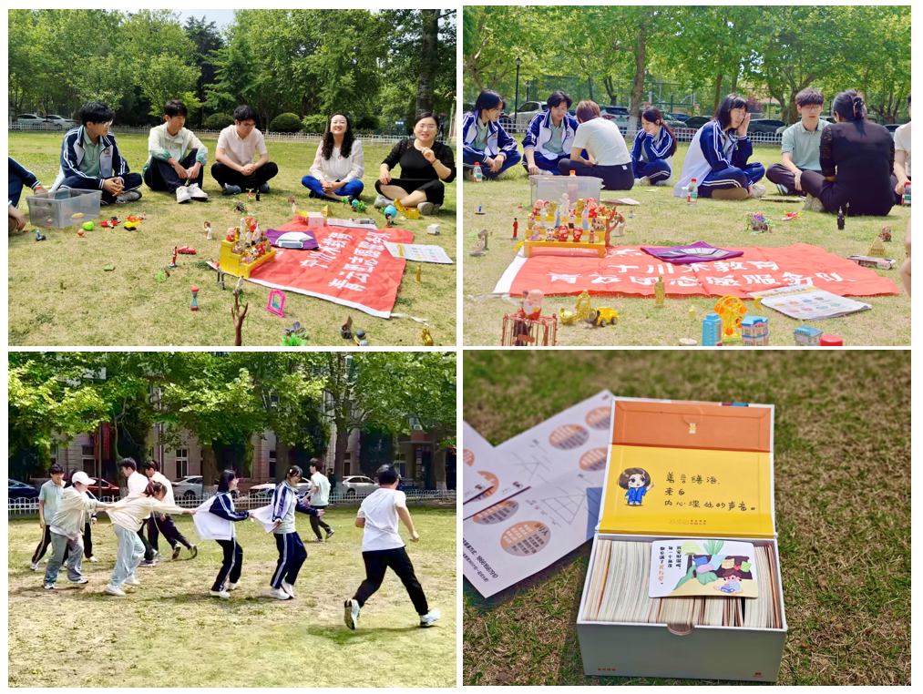 童年暗号:玩具重构成长隐喻。活动从阳光草坪上的自由创作拉开序幕。参与者围坐于草坪,利用积木、绿植等道具搭建充满想象力的微缩世界。看似简单的玩具组合,实则映射出内心的情感与成长轨迹。通过搭建城堡、小人等场景,学生们在童趣中完成了一次自我隐喻的表达,重拾纯真体验,为后续心理探索奠定温暖基调。