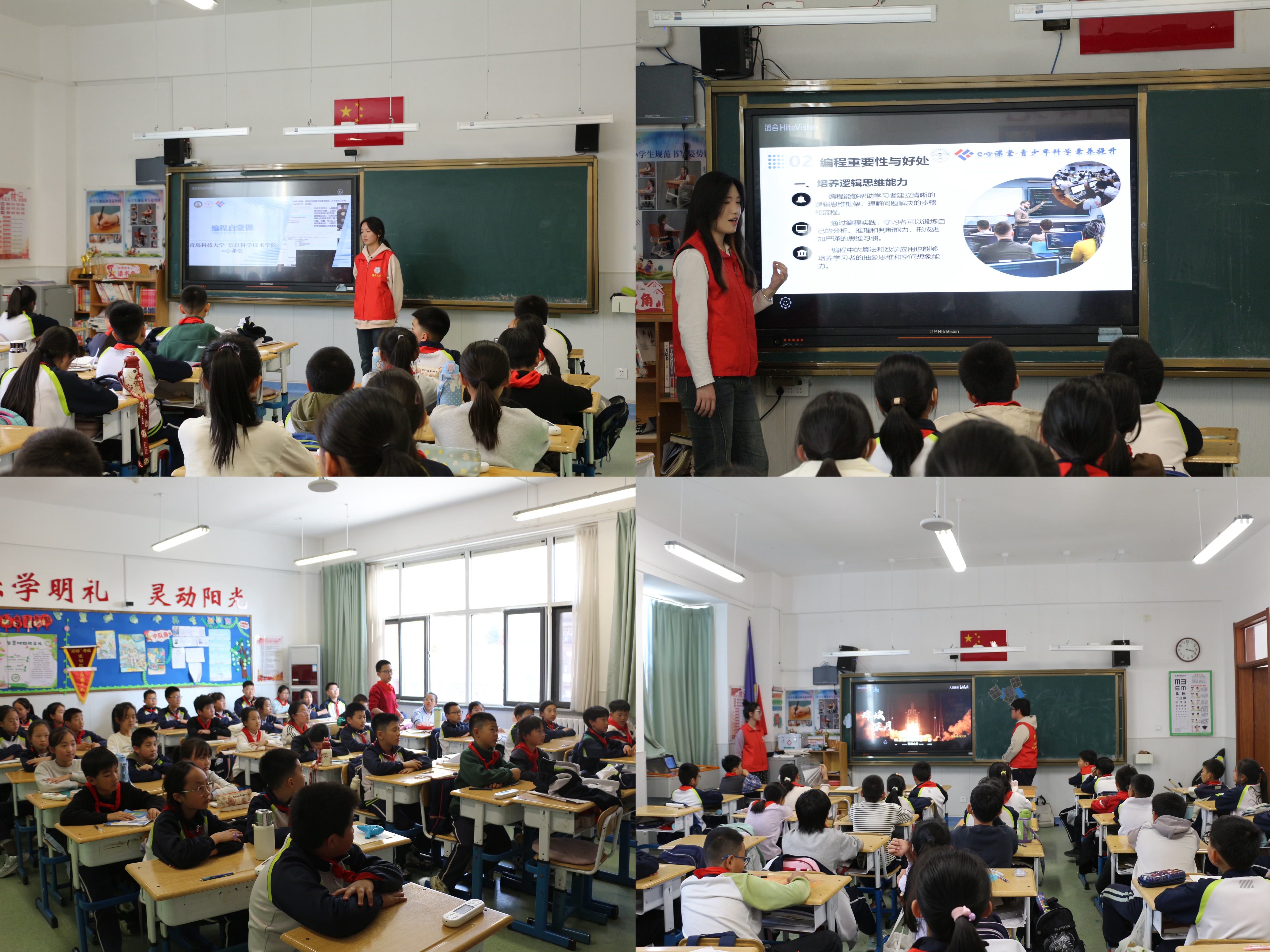 4月15日,青岛科技大学信息科学技术学院青衿志愿服务协会发挥专业优势,在崂山区第三实验小学开展“e心课堂”志愿服务活动。