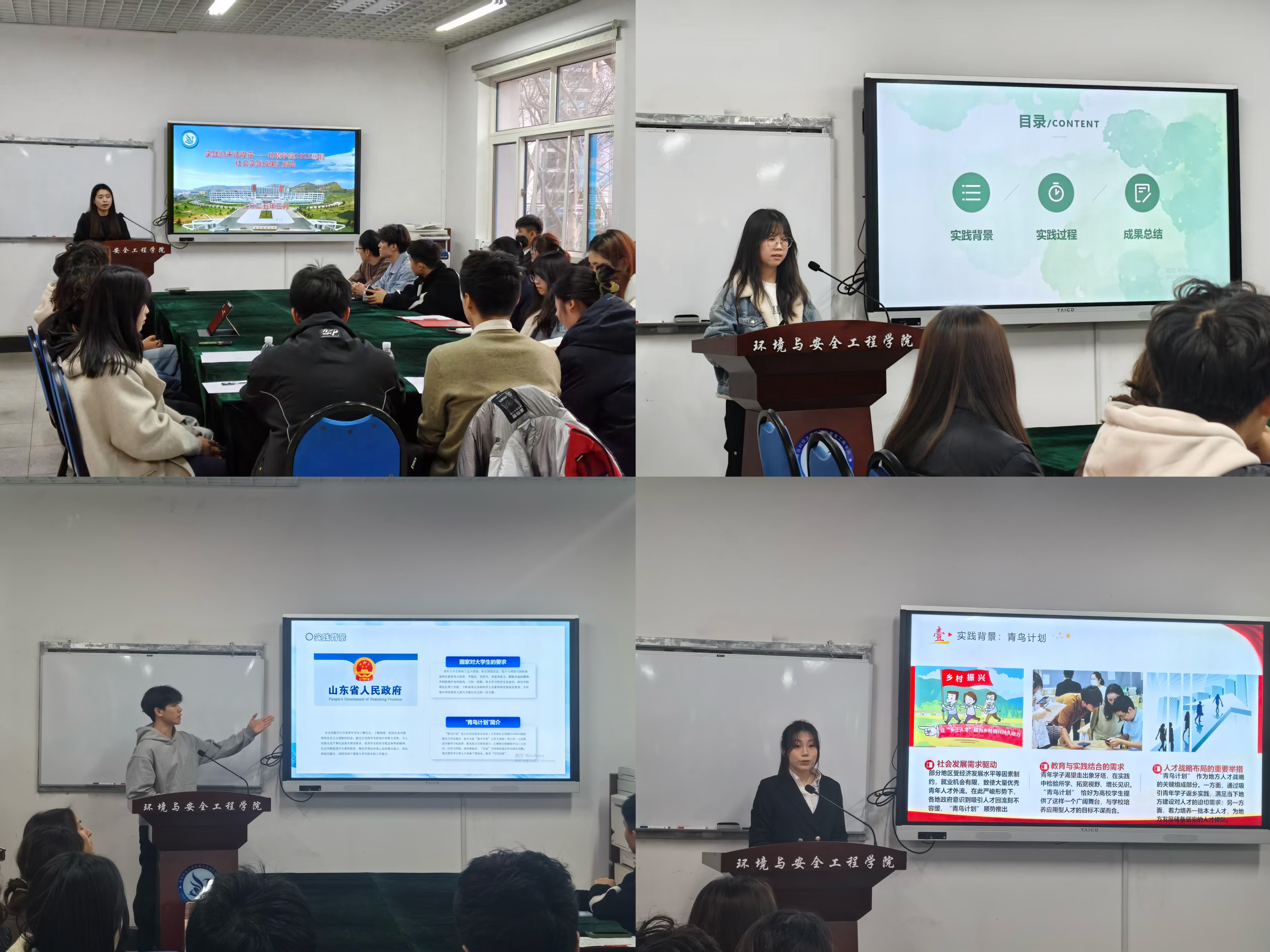 汇报会上,各队伍汇报人紧密结合实践实情,从实践背景、开展过程、成果感悟等方面进行汇报展示。兰雨鑫分享了芝罘区通伸街道的实习经历,她表示,通过实践加深了对芝罘区城市规划和环保项目的认识,坚定了毕业后返乡建设家乡的决心;崔瑜珂分享了在周村区住建局实习经历,通过参与住房普查录入、元宵节民俗展演志愿者等工作,体会到了基层工作艰辛,表示要不断加强专业知识学习,用所学知识奉献社会;桑佳琪分享了在临淄区环保局的工作经历,深切感受到人工智能技术为生态环境治理带来的革命性变革,她表示,要加强人工智能与环保领域深度融合的学习,不断助力生态环境治理;杨少谦分享了在曲阜自然资源局森林防火科的实习经历,表示要将所学专业知识应用到实际工作中,为生态保护贡献智慧和力量。