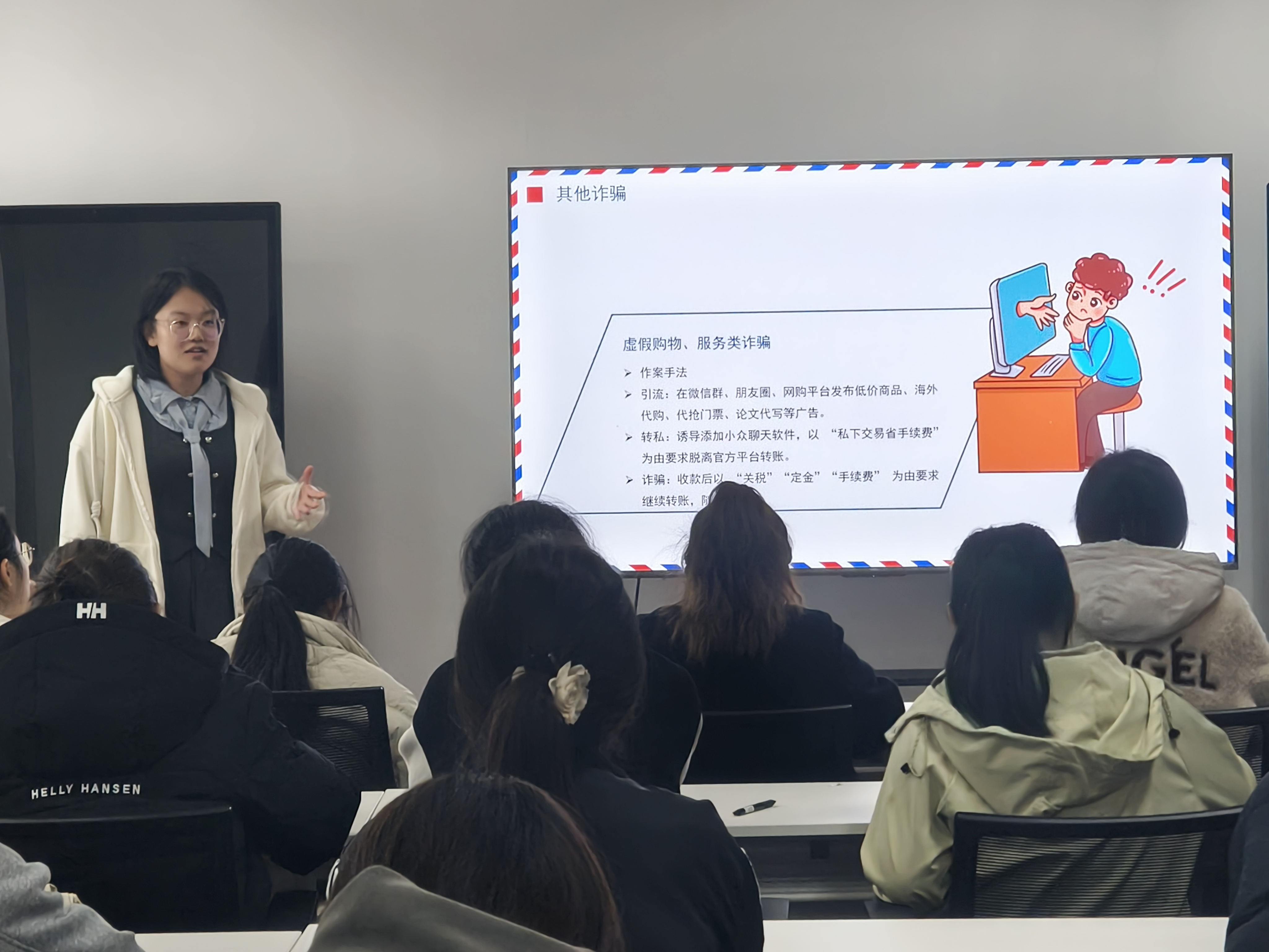 在经典案例分享环节,重点剖析了“美容被贷款”“兼职洗钱涉帮信罪”“校园借贷骗局”“分期手机诈骗”等真实案例。这些案例通过还原受害者从被诱骗到遭受损失的全过程,揭示了诈骗分子利用师生社会经验不足、贪图小利等心理实施诈骗的套路,并结合《中华人民共和国刑法》相关条款,讲解了帮信罪的法律定义、认定标准及法律后果,强调了出租、出借银行卡的严重危害。