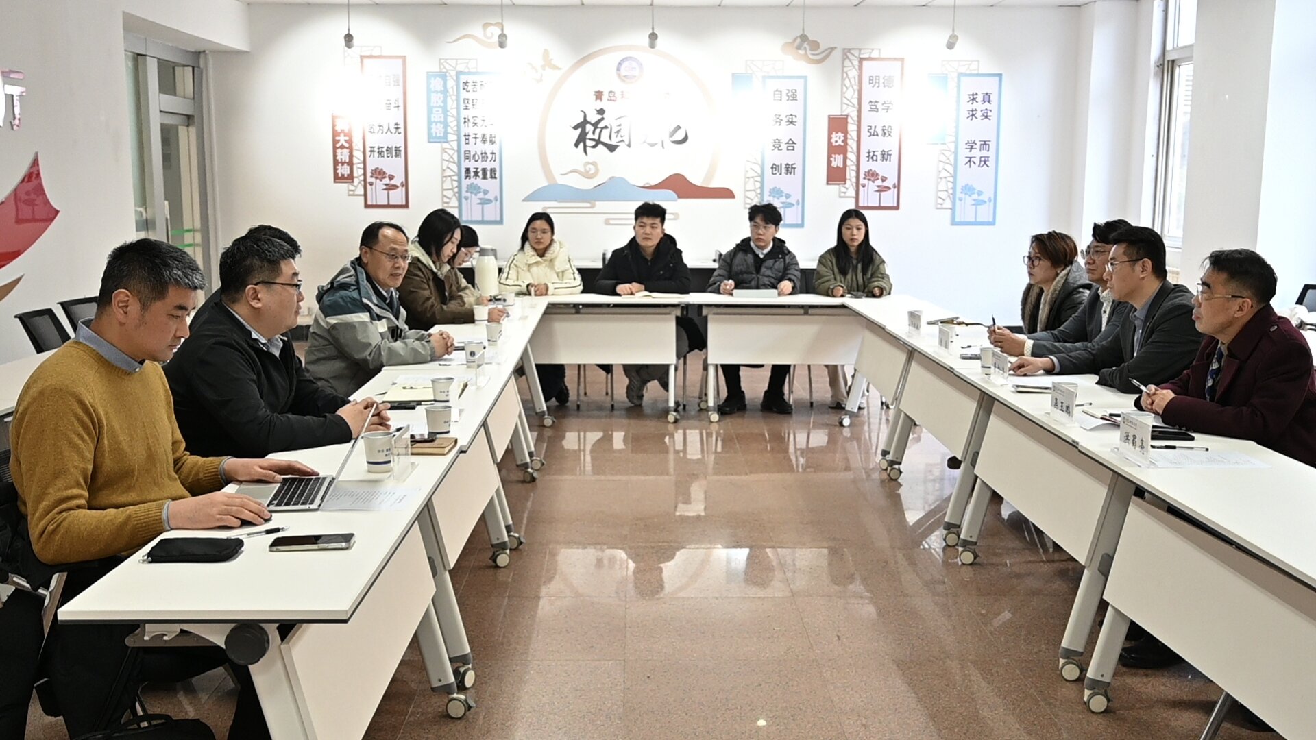 为进一步深化校企合作,完善协同育人机制,推动优质教育资源与行业实践资源精准对接,12月11日,法学院在一站式学生社区开展校企交流活动。泰和泰(青岛)律师事务所执行主任綦松涛一行、法学院党委书记曲明、院长王金堂、副院长綦磊、党委副书记兼副院长王祥梅以及师生代表参加活动。