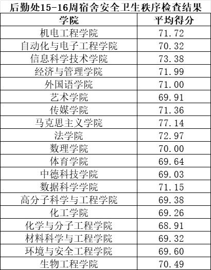 根据学校工作安排,后勤管理处组织公寓管理人员开展崂山、四方校区15-16周宿舍安全卫生秩序检查。本次共检查宿舍4753间,经统计,合格及以上宿舍4645间,不合格宿舍108间。各学院平均得分如下所示。